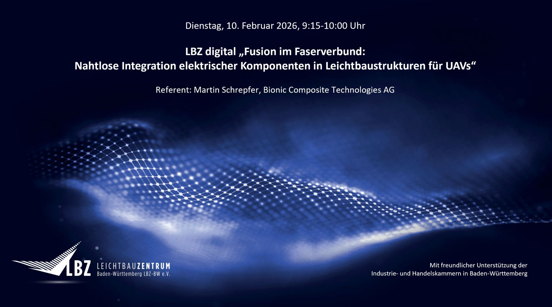 Wir freuen uns, Sie am Dienstag, 10. Februar 2026 mit LBZ digital „Fusion im Faserverbund: Nahtlose Integration elektrischer Komponenten in Leichtbaustrukturen für UAVs“ von 9:15-10:00 Uhr virtuell zu Bionic Composite Technologies AG / BIONTEC einladen zu dürfen.